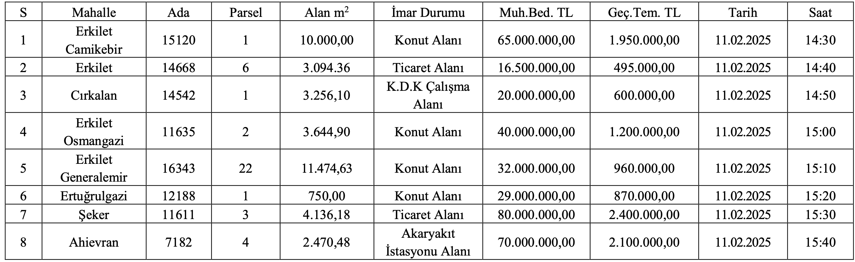 Söz konusu arsaların satış ihalesi 11 Şubat 2025 tarihinde saat 14.30 ile 15.40 arasında Kayseri