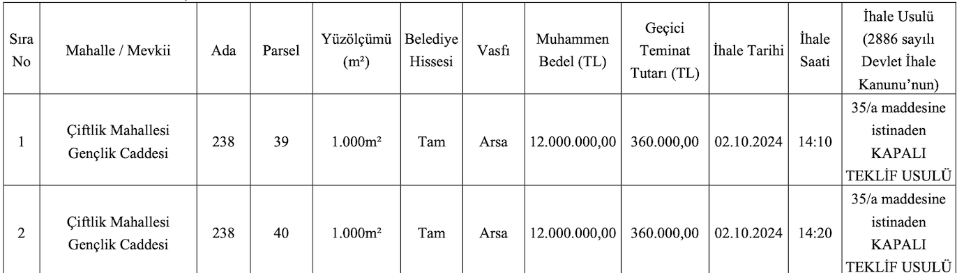 Madde 1- 11.09.2024 tarih ve 150 numaralı Encümen Kararına istinaden Yalova İli, Çiftlikköy İlçesi, Çiftlikköy Belediye sınırları içerisinde bulunan mülkiyeti Belediyemize ait aşağıda nitelikleri belirtilen taşınmazın (arsa); 2886 sayılı Devlet İhale Kanunun 35/a maddesine istinaden KAPALI TEKLİF USULÜ ile ihale edilerek satışı yapılacaktır.