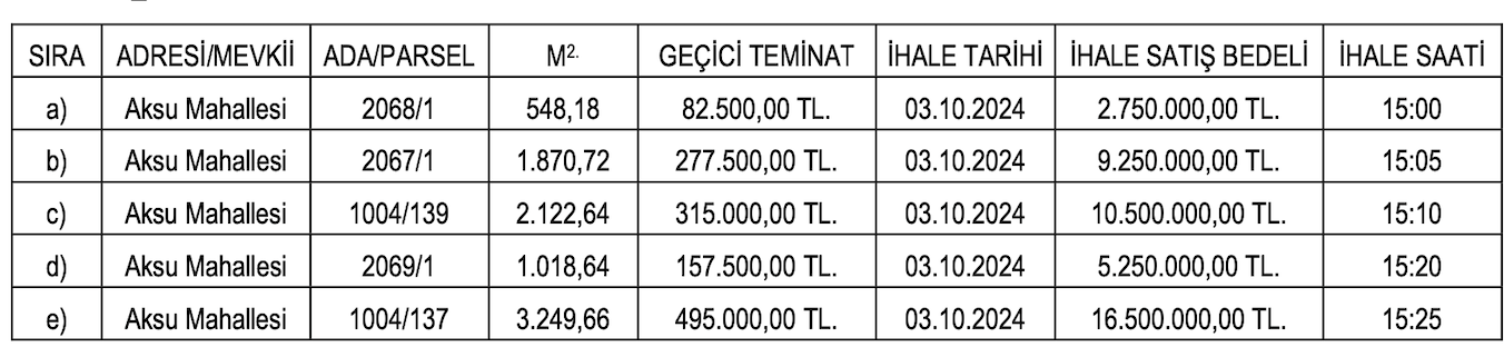 Giresun Belediye Başkanlığı tarafından satışa çıkarılan ve Aksu mahallesinde yer alan 5 adet arsanın yüz ölçümleri 548,18 metrekare ile 3 bin 249,66 metrekare arasında değişiyor.