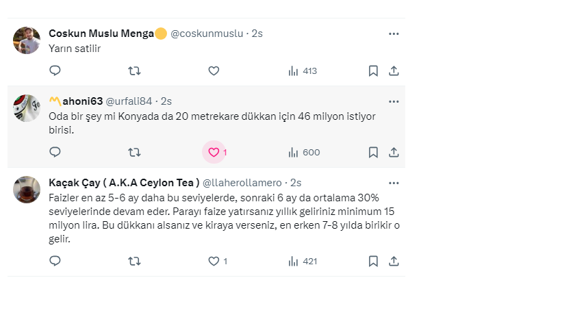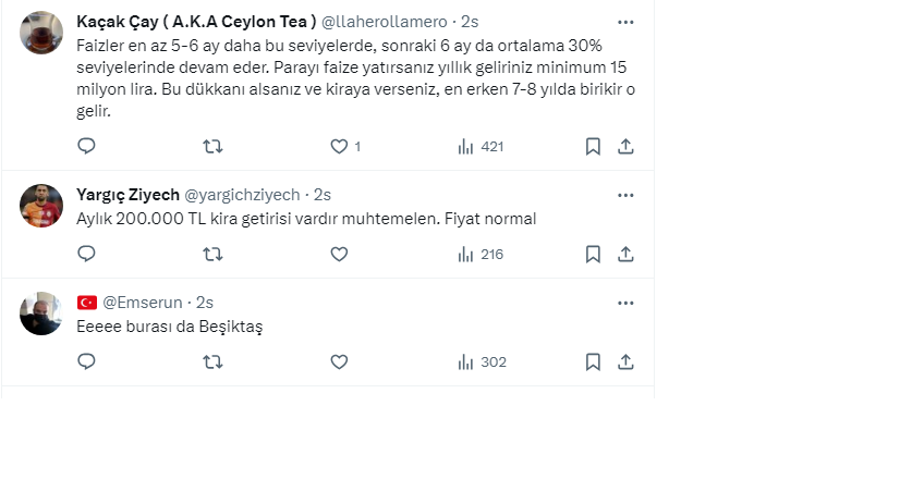 Kaçak Çay ( A.K.A Ceylon Tea ) @llaherollamero: ''Faizler en az 5-6 ay daha bu seviyelerde, sonraki 6 ay da ortalama 30% seviyelerinde devam eder. Parayı faize yatırsanız yıllık geliriniz minimum 15 milyon lira. Bu dükkanı alsanız ve kiraya verseniz, en erken 7-8 yılda birikir o gelir. Aylık 200.000 TL kira getirisi vardır muhtemelen. Fiyat normal''