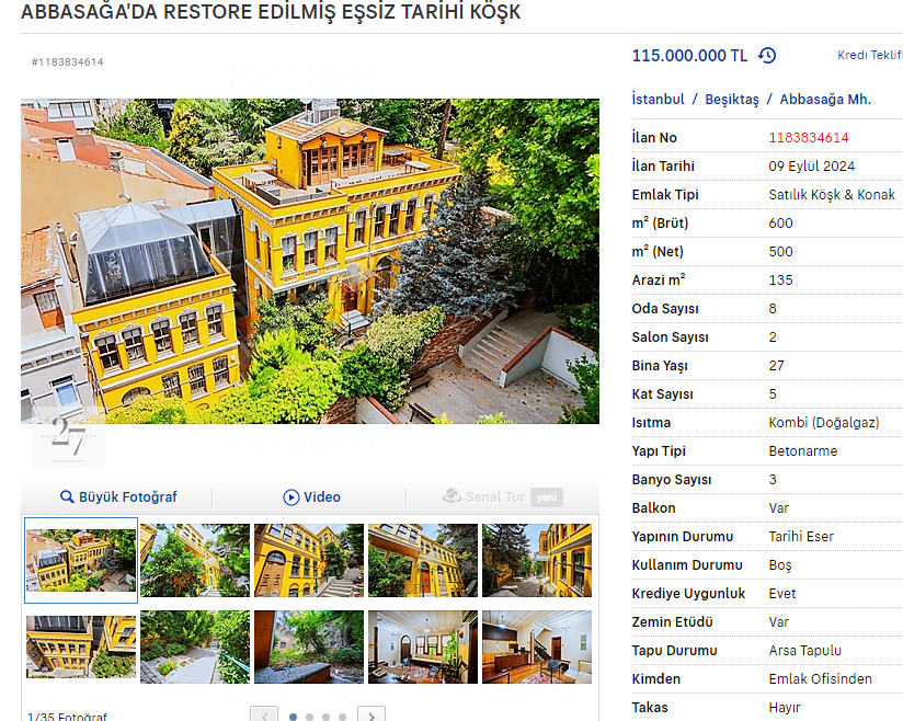 Beşiktaş Abbasağa Mahallesi'nde konumlanan 600 metrekarelik beş kat ve sekiz odadan oluşan tarihi köşk 115 milyon liraya satılıyor.