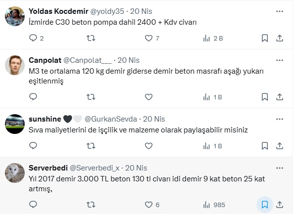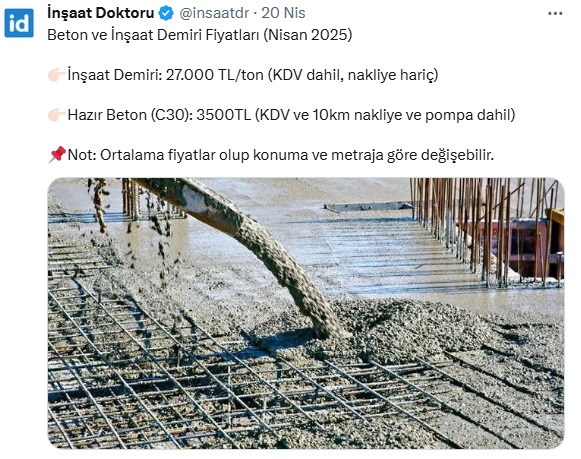 İnşaat Doktoru, sosyal medya hesbaından 2025 Nisan inşaat demir fiyatları ile beton fiyatlarını açıkladı. İşte güncel beton ve demir fiyatları...