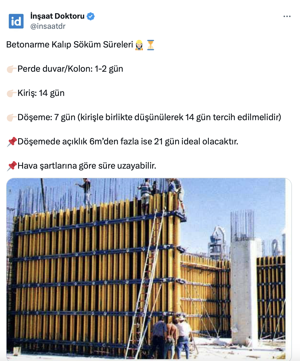 İnşaat Doktoru, resmi sosyal medya hesabı üzerinden betonarme kalıp söküm süreleri ile ilgili olarak yaptığı paylaşımda söz konusu süreleri perde duvar/kolon için 1-2 gün, kiriş için 14 gün, döşeme için 7 gün olarak açıkladı.