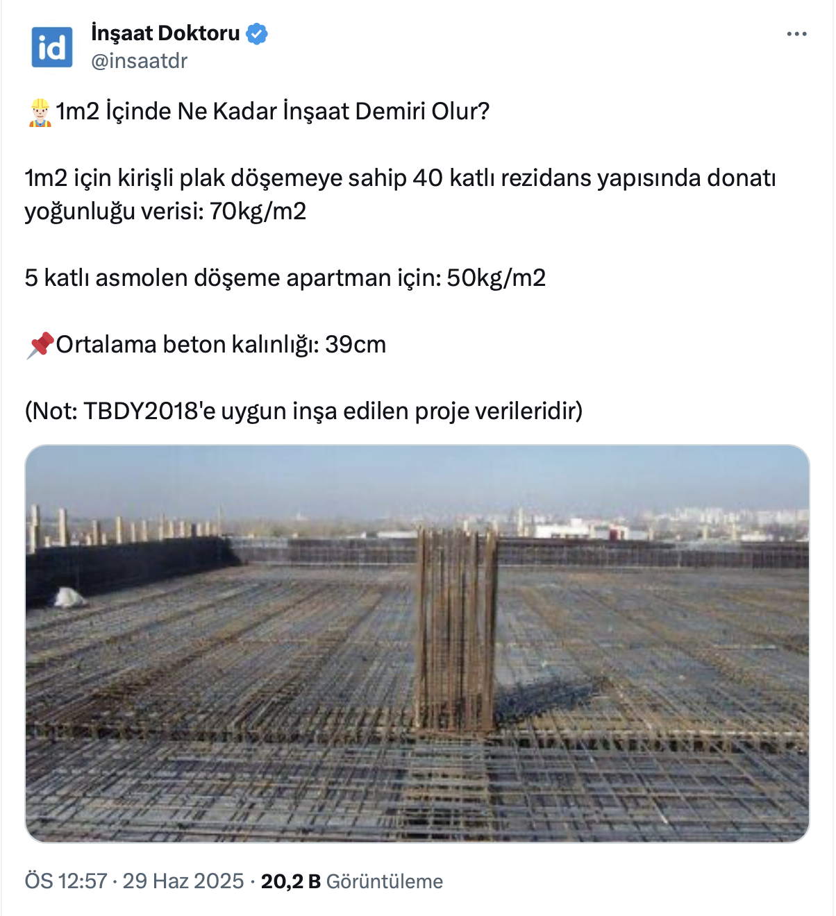 İnşaat Doktoru yaptığı paylaşımda betonarme yapılarda 1 metrekare içinde ne kadar inşaat demiri olduğunu açıkladı.
