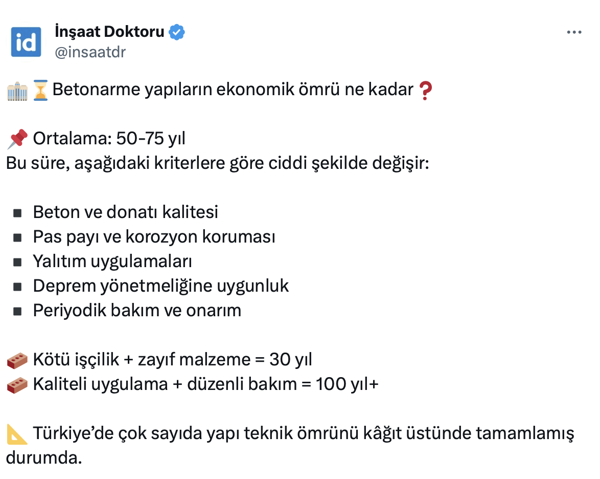 İnşaat sektörü ile ilgili olarak yaptığı paylaşımlarına hız kesmeden devam eden 52,1 bin takipçili İnşaat Doktoru resmi X hesabı https://twitter.com/insaatdr üzerinden yaptığı paylaşımda betonarme yapıların ekonomik ömrünün 50-75 yıl olduğunu belirtti.