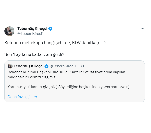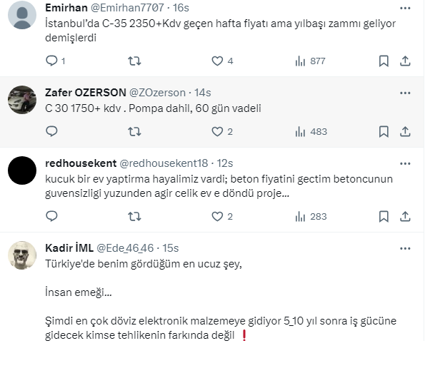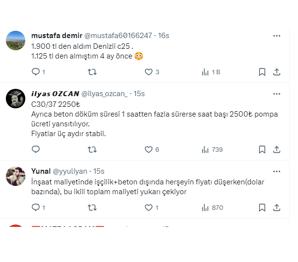 @ilyas_ozcan_: ''C30/37 2250₺ Ayrıca beton döküm süresi 1 saatten fazla sürerse saat başı 2500₺ pompa ücreti yansıtılıyor. Fiyatlar üç aydır stabil.''