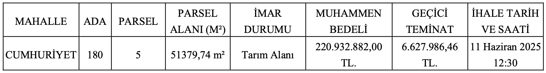 Satışa çıkarılan arazinin muhammen bedelki 220 milyon 932 bin 882 metrekare olarak açıklanırken, geçici teminat bedeli ise 6 milyon 627 bin 986,46 metrekare olarak açıklandı.