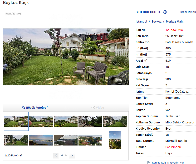 Beykoz'da satılık ev ilanları içinde en pahalı olanlardan biri de 310 milyon liraya satılan köşk dikkatleri çekiyor 400 metrekarelik 200 yıllık tarihi eser köşk 310 milyon liraya satışa çıkarıldı.