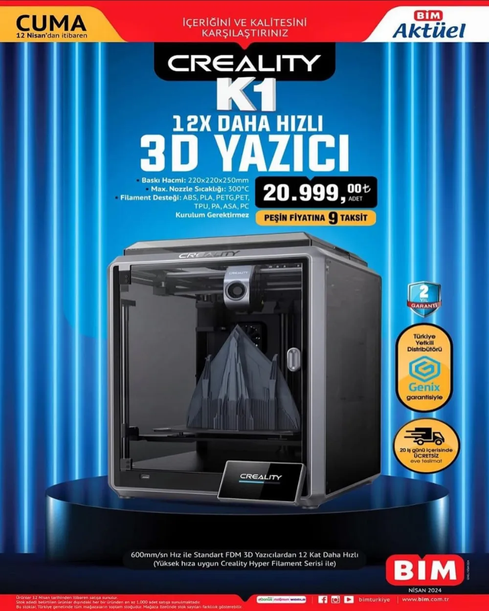 Creality K1 12X Daha Hızlı 3D Yazıcı 20.999 Türk Lirası.