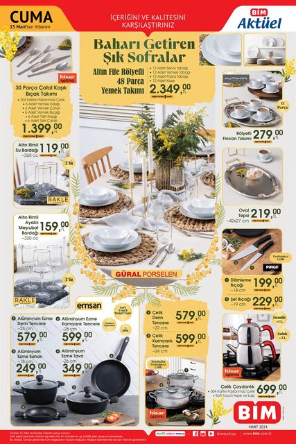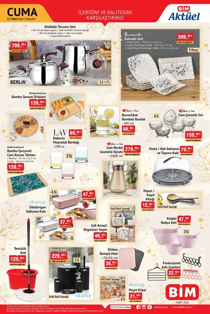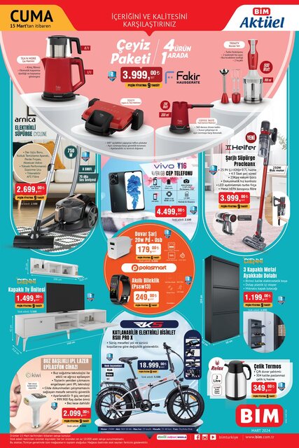 BİM 15 Mart 2024 aktüel ürünler kataloğunu internet sayfası üzerinden paylaştı. BİM'de yarın, kişisel ürünlerden, beyaz eşyaya, televizyondan, kahve makinesine kadar birçok seçili ürün raflardaki yerini aldı. İşte BİM aktüel kataloğu ile indirimli ürünlerin fiyatları.