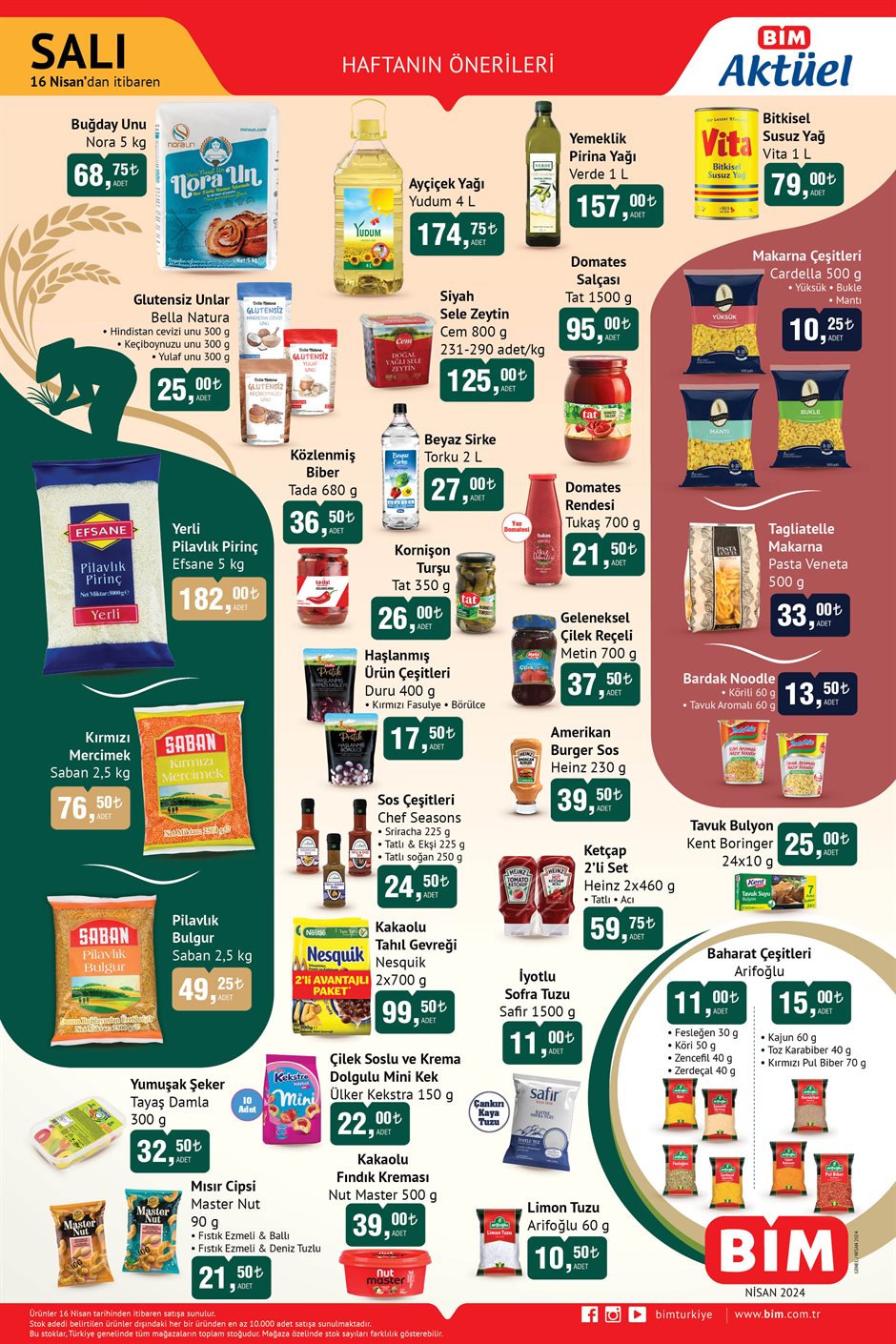 Perakende devi Bim, tüketiciler tarafından merakla beklenen 16 Nisan 2024 tarihli aktüel kataloğunu yayımladı. Bim'de bu hafta peynir, ayçiçek yağı, salça, makarna ve deterjanda indirim var...