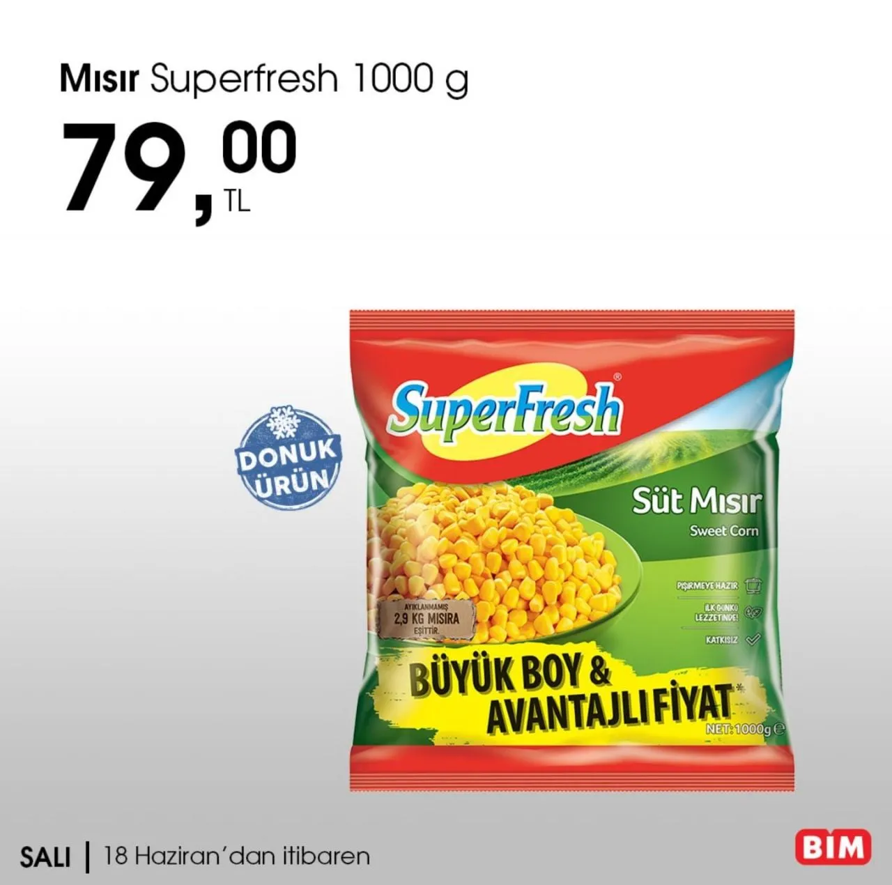 BİM markette 18 Haziran 2024 aktüel ürünler kataloğunda, Mısır Superfresh 79 Türk Lirası, Siyah Zeytin 129 Türk Lirası,Beyaz Sirke Torku 27,50 Türk Lirası, İçim Yağlı Yoğurt 109 Türk Lirası.