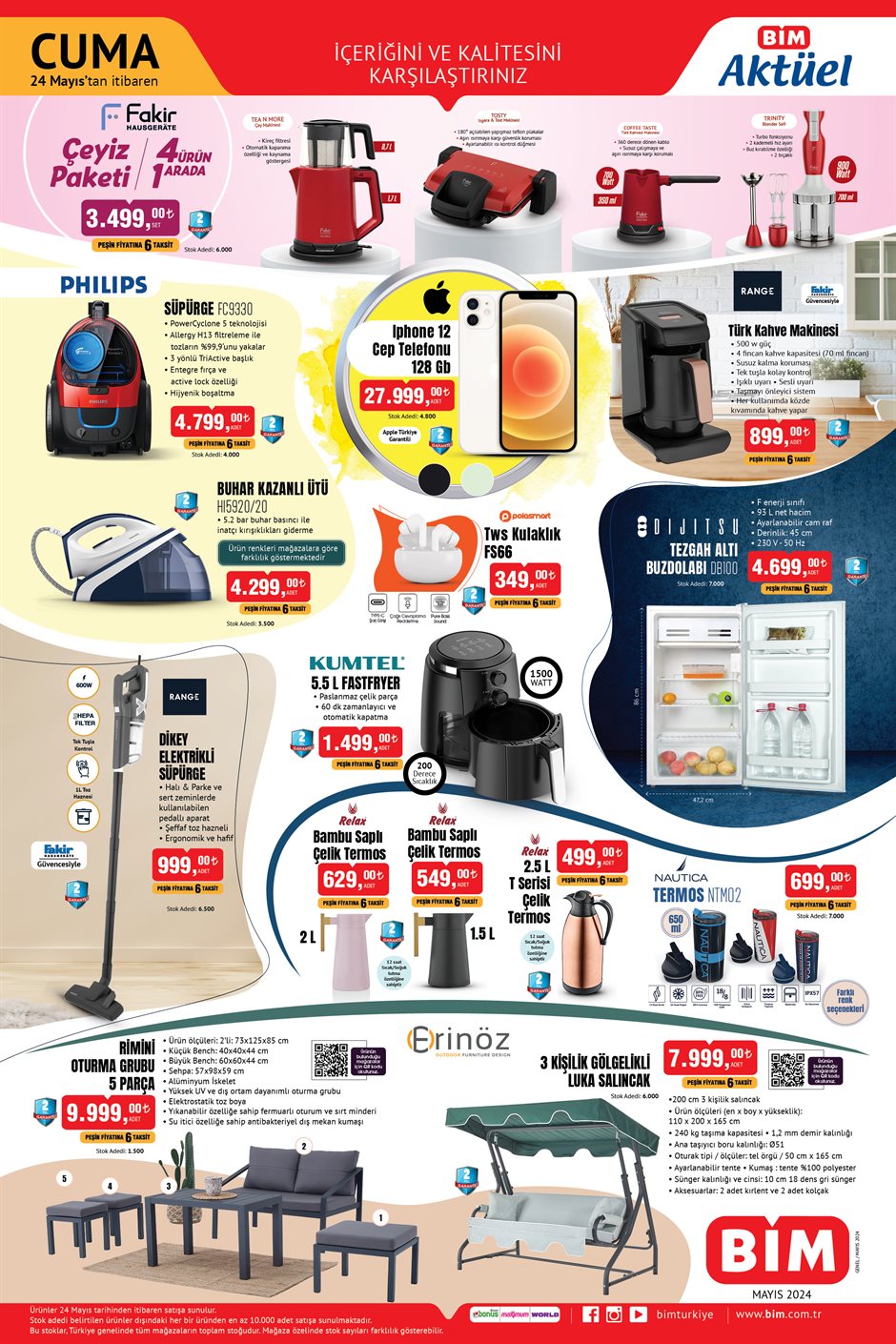 BİM 24 Mayıs 2024 aktüel ürünler kampanya kataloğu yayınlandı. BİM'de bu hafta 24 Mayıs ile 31 Mayıs 2024 tarihleri arasında geçerli olacak aktüel ürünlerin listesi belli oldu. 24 Mayıs 2024 Cuma gününden itibaren BİM Market mağazaarında Iphone 12 Cep Telefonu 27.999 TL, Philips Buhar Kazanlı Ütü 4.299 TL'den satılacak. Peki Cuma günü BİM'e ne gelecek? BİM'e Cuma günü ne geliyor? BİM 20 Mayıs 2024 aktüel ürünler...