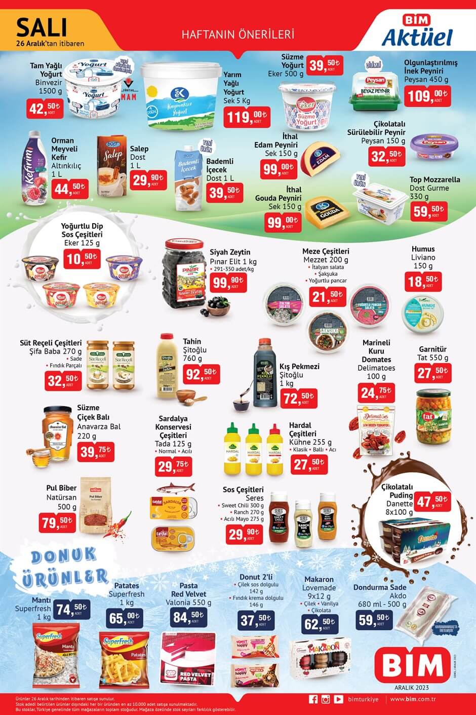 BİM'in 26 aralık 2023 tarihli aktüel ürünler kataloğu yayımlandı. Her hafta BİM tarafından paylaşılan katalogda kaçırılmayacak fırsatlar yer alıyor. BİM'de bu hafta Binvezir Tam Yağlı Yoğurt, Anavarza Süzme Çiçek Balı, Torku Dana Kangal Sucuk ve Namet Soslu Dana Döner gibi ürünler satılacak. Peki, BİM'de bu aktüel ürünlerin fiyatı ne kadar, kaç TL? İşte BİM 26 aralık 2023 aktüel ürünler kataloğu...