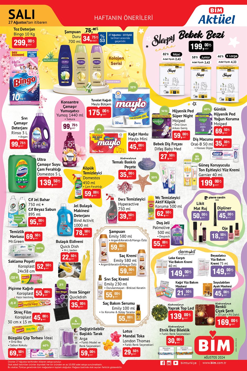 BİM 27 Ağustos 2024 Aktüel Ürünler Kataloğu: Bingo toz deterjan 10 kg 299 TL, Sleepy bebek bezi 199 TL!
