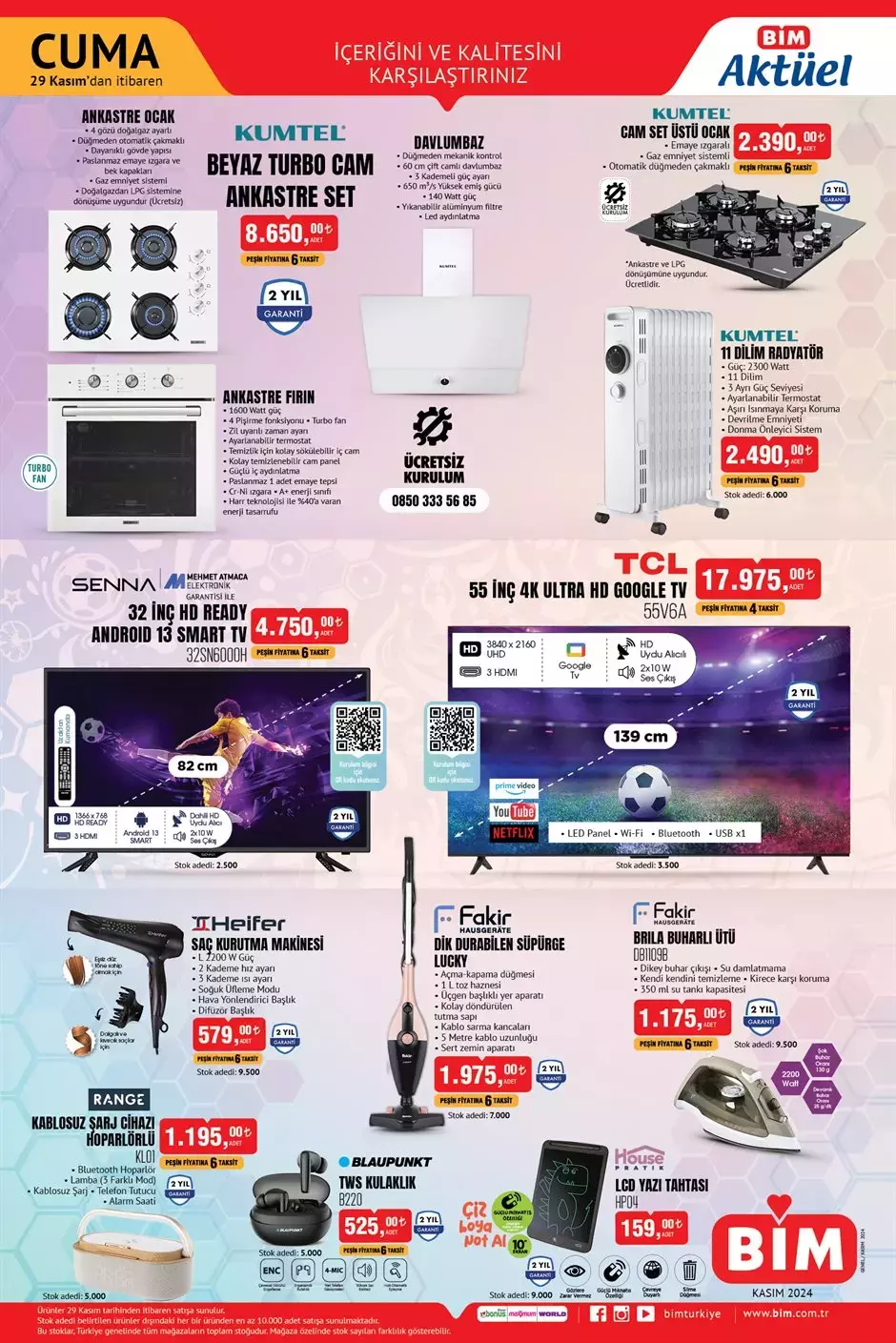 BİM'de bu hafta Kumtel 11 Dilim Radyatör 2.490 TL, Senna 32' HD Ready Android 13 Smart Tv 4.750 TL, TCL 55' 4K Ultra HD Google Tv 17.975 TL, Heifer Saç Kurutma Makinesi 579 TL'den BİM online satışta olacak.