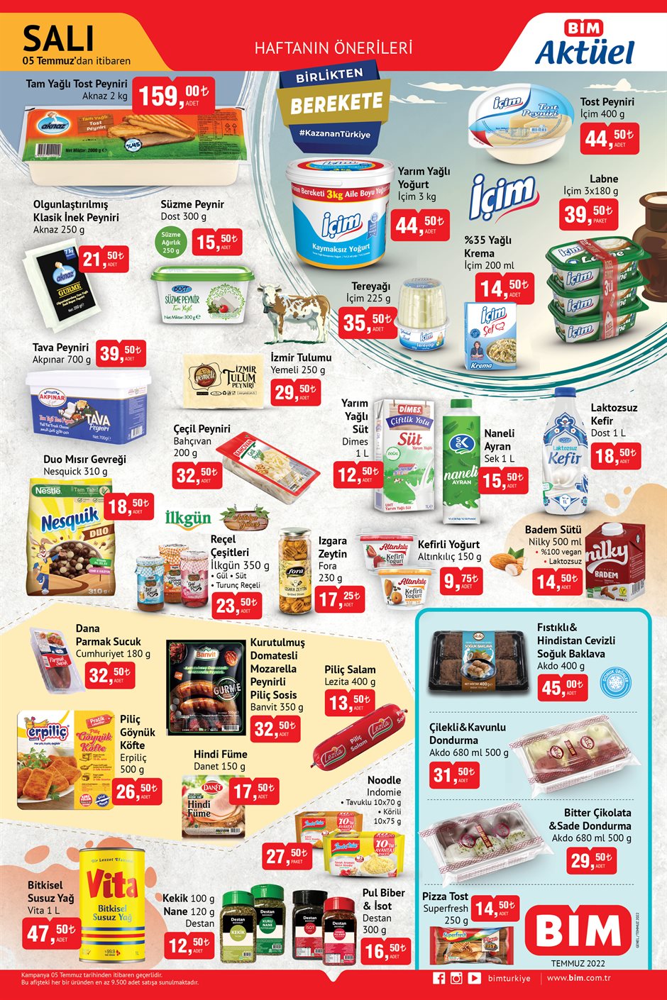 BİM Market'in 5 Temmuz 2022 Salı aktüel ürünler kataloğu belli oldu. Her hafta BİM Market tarafından yayımlanan aktüel ürünler kataloğunda bu hafta da yok yok! BİM'in aktüel ürünler kataloğunda; sucuk, süt, kağıt havlu, çamaşır suyu, baharat çeşitleri, salam, toz çamaşır deterjanı, yoğurt, reçel gibi ürünler yer aldı. Peki, aktüel ürünler kataloğundaki ürünlerin fiyatı ne kadar oldu? İşte 5 Temmuz 2022 aktüel ürünler kataloğu fiyat listesi...