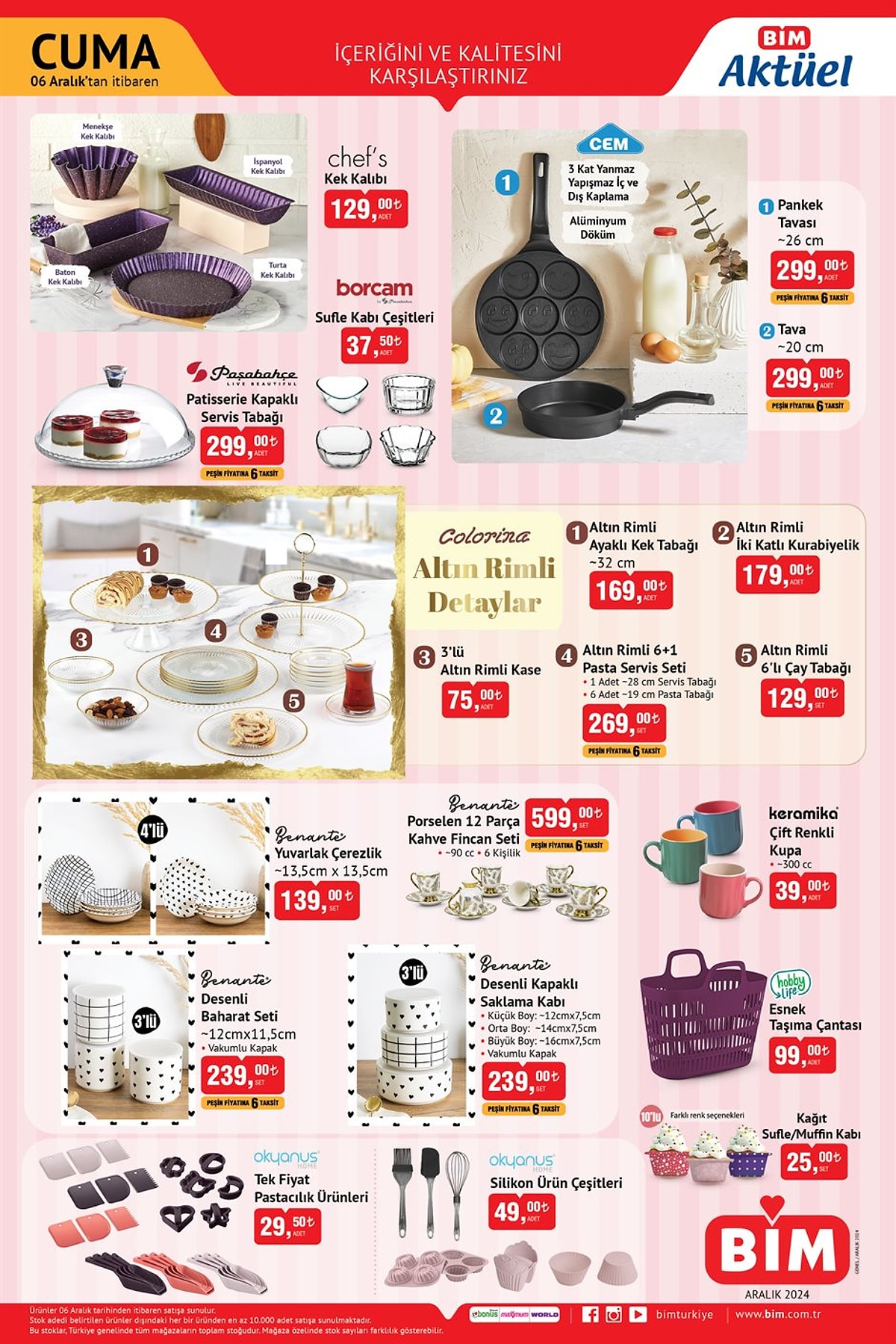 BİM aktüel kataloğundaki birbirinden cazip indirimli ürünler raflarda yeriniğ alacak. BİM'de önümüzdeki hafta cuma günü Colorina Altın Rimli 6+1 Pasta Servis Seti 269 TL, Paşabahçe Patisserie Kapaklı Servis Tabağı 299 TL, Mehtap Kapaklı Balık Tavası 389 TL