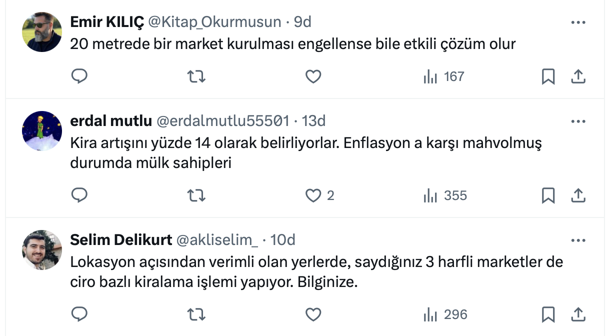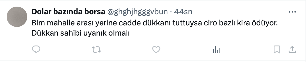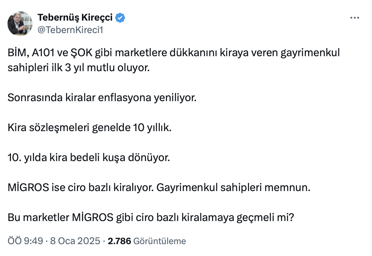 Paylaşımında kira sözleşmeleri genelde 10 yıllık olduğunu belirten Tebernüş Kireçci, "10. yılda kira bedeli kuşa dönüyor. Migros ise ciro bazlı kiralıyor. Gayrimenkul sahipleri memnun. Bu marketler Migros gibi ciro bazlı kiralamaya geçmeli mi?” ifadelerini kullandı.