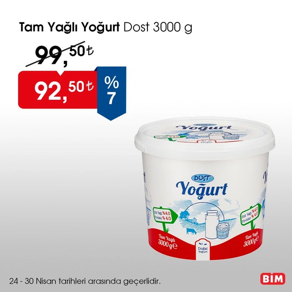 3000 gr Tam Yağlı Dost Yoğurt 92.50 Türk Lirası.