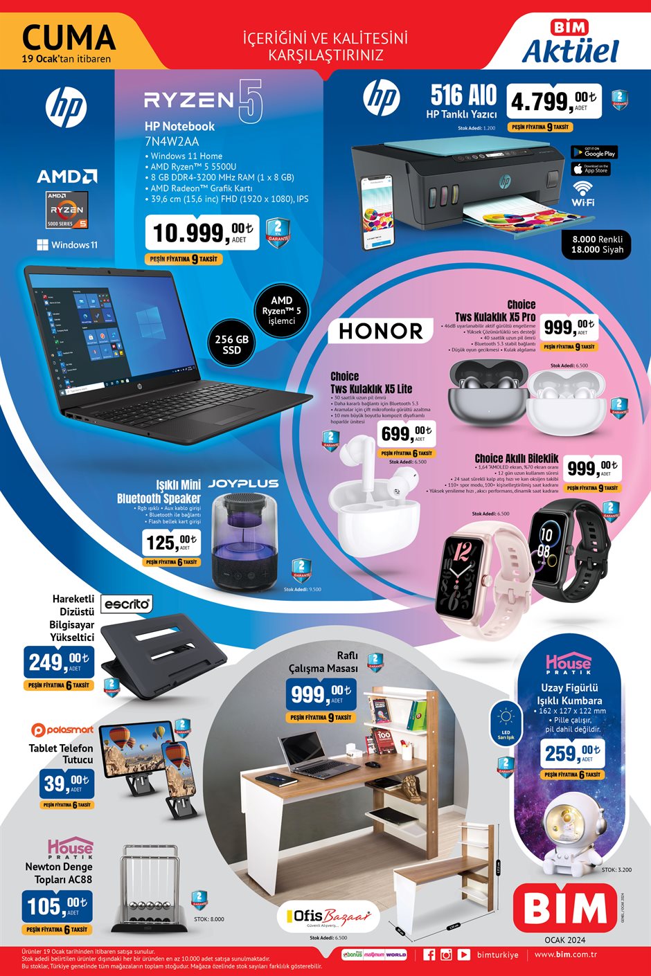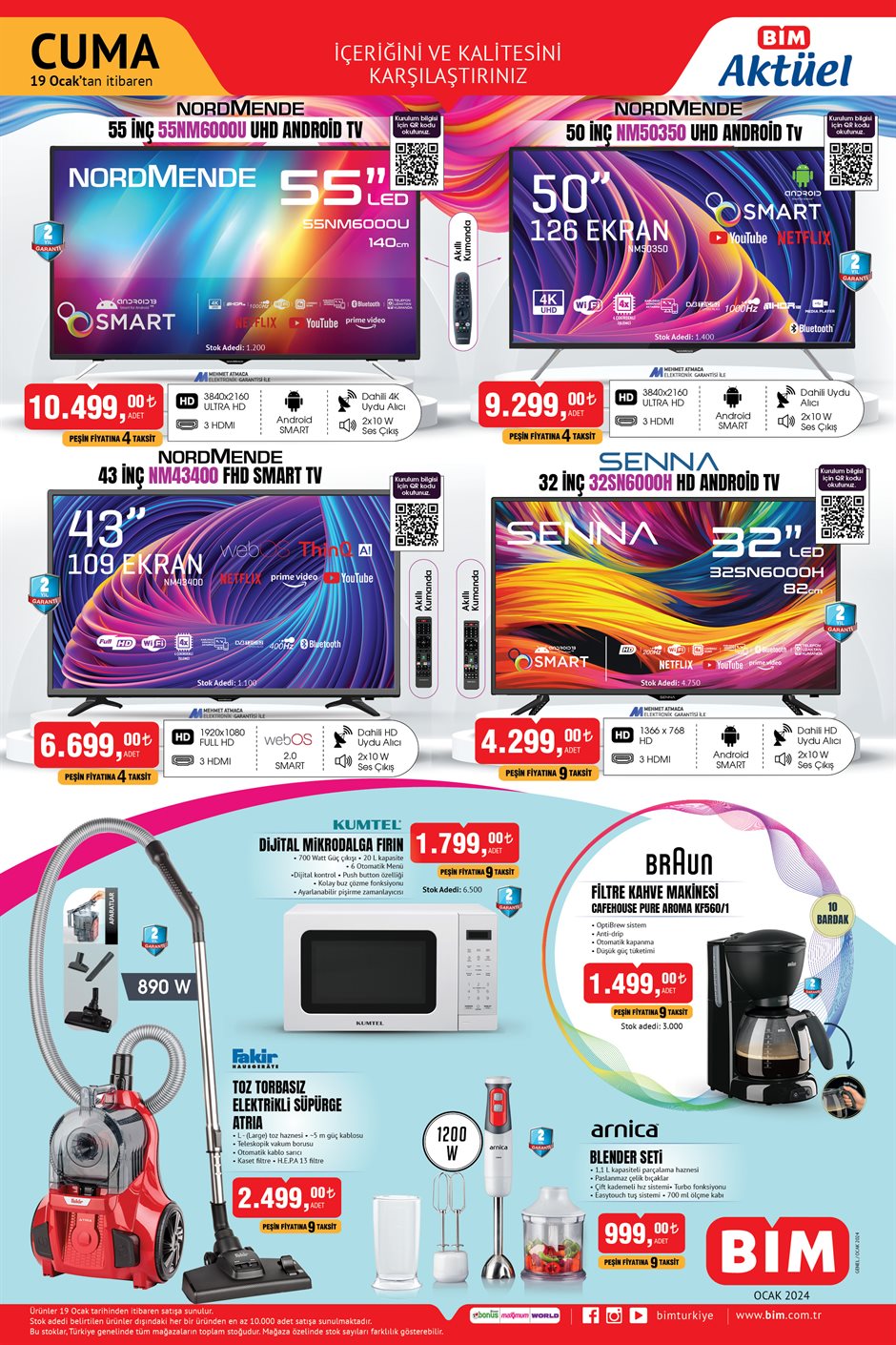 BİM 19 Ocak 2024 tarihi itibarıyla satışa çıkaracağı aktüel ürünler kataloğunu belli oldu. BİM'de bu hafta tüm ihityaçlarınızı giderebileceksiniz. Teknolojiden ev alaetlerine kadar aradığınız tüm ürünler bu hafta cuma günü raflarda yerini alacak. Bu hafta cuma günü BİM'de 55 UHD Android Tv 10.499 TL, Arnica Blender Seti 999 TL, Braun Filtre Kahve Makinesi 1.499 TL'ye satılıyor. İşte BİM 19 Ocak 2024 aktüel ürünler kataloğu...