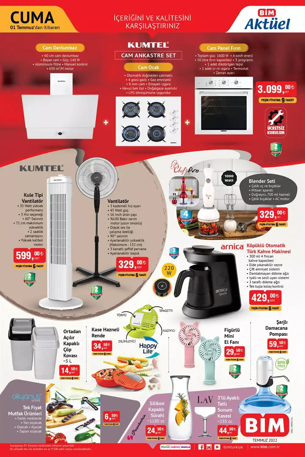 BİM Market'in 1 Temmuz 2022 aktüel ürünler kataloğu ve fiyat listesi yayımlandı. Haftanın belli günlerinde BİM tarafından paylaşılan aktüel ürünler kataloğunda yok yok! Bu hafta BİM Markete uğramadan sakın alışveriş yapmayın! BİM Marketin 1 Temmuz 2022 aktüel ürünler kataloğunda; Cam davlumbaz, cam ankastre set, panel fırın, Tür Kahvesi makinesi, blender seti, vantilatör, bisiklet, tekstil ürünleri, seyahat valizi, ütü, çocuk oyuncak çeşitleri ve pek çok ürün yer aldı. Peki bu ürünlerin fiyatı kaç TL oldu? İşte 1 Temmuz 2022 BİM aktüel ürünler kataloğu fiyat listesi...