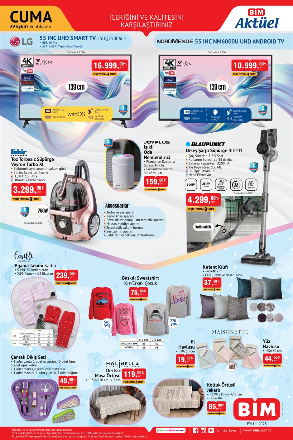 BİM 29 Eylül Cuma aktüel ürünler kataloğunu yayımladı. Bu kapsamda Fakir toz torbasız süpürge 3 bin 299 TL'ye, 6'lı porselen kaşık seti 27 TL'ye satılacak. İşte detaylar...