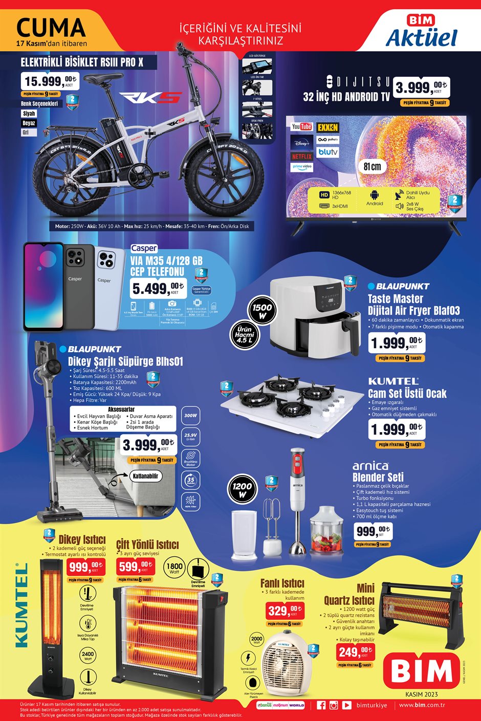 BİM'in 17 Kasım 2023 tarihli indirimli aktüel ürünler kataloğu belli oldu. BİM'de bu hafta elektrikli küçük ev aletlerinden elektrikli bisiklete, televizyondan telefona, mutfak araç gereçlerine ev aksesuarlarına kadar pek çok ürün yer aldı. Peki, BİM'de bu aktüel ürünlerin fiyatı ne kadar, kaç TL? İşte BİM aktüel ürünler kataloğu fiyat listesi...