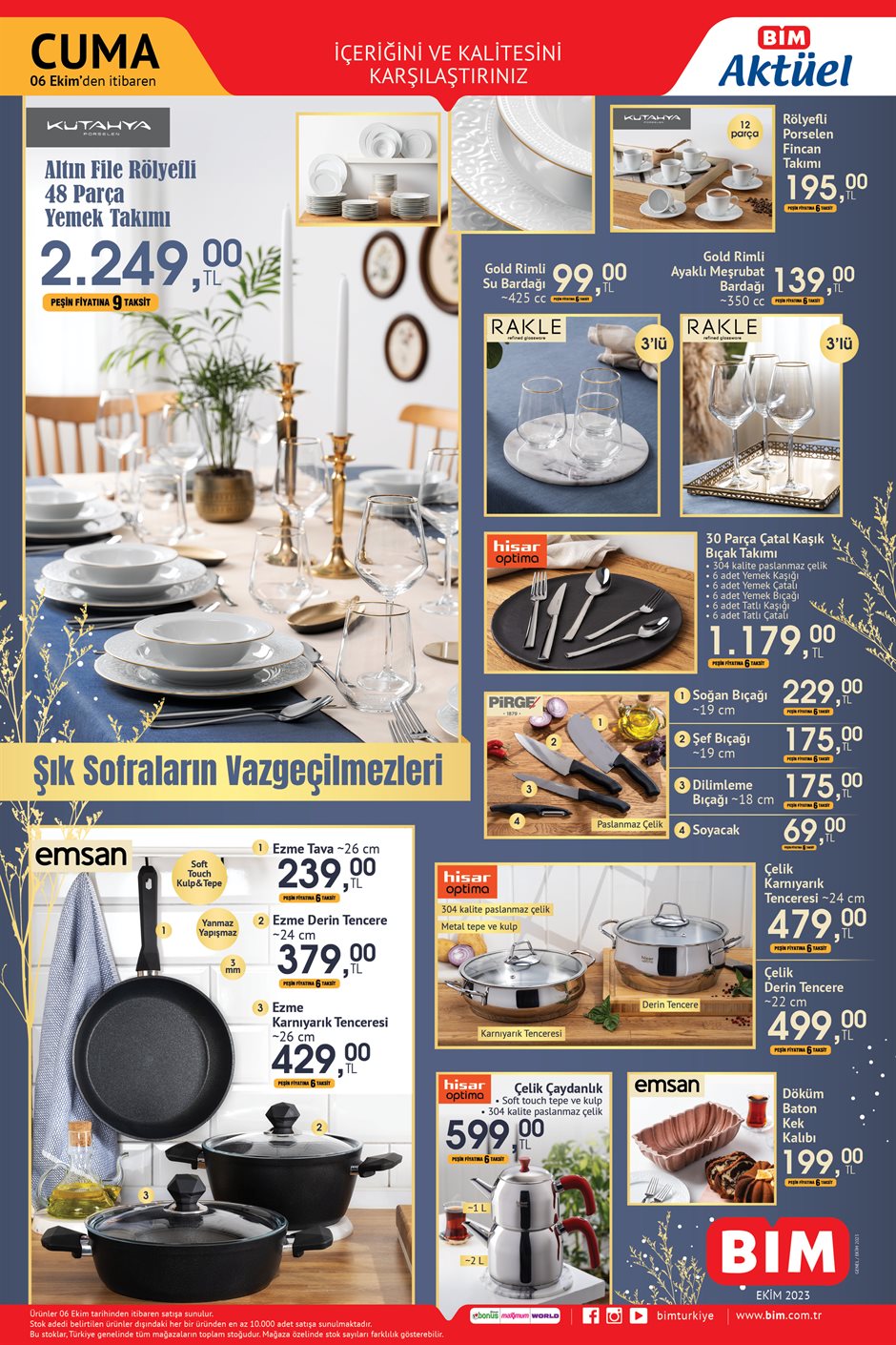 BİM 6 Ekim 2023 tarihli aktüel ürünler kataloğunu yayımladı. BİM'de bu hafta Kütahya Porselen 48 parça yemek takımı 2 bin 249 TL'ye, 30 parça çatal kaşık bıçak takımı 1.179 TL'ye satılacak.