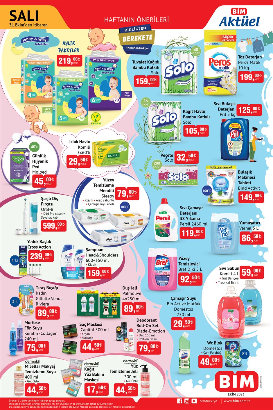 BİM'in 31 Ekim 2023 tarihli aktüel ürünleri yayımlandı. Paylşaılan katalogda, Oral-B Şarjlı Diş Fırçası 599 TL, Jenny Willy Aylık Paketler 219 TL'ye satışa sunuldu. İşte 31 Ekim 2023 aktüel ürünler kataloğu...