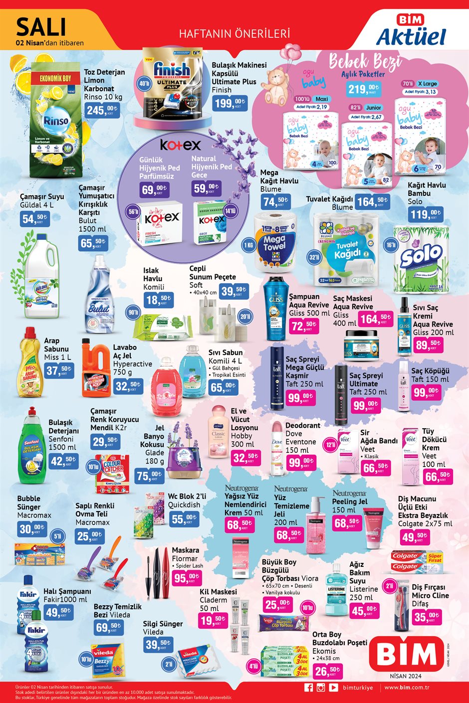 BİM'DE 2 Nisan ile 9 Nisan arasında gelecek ürünlerin listesi belli oldu. Fırsat ürünler olarak geçen ürünler içinde giyecekten yiyeceğe, temizlik malzemelerine kadar her şey yer alıyor. BİM 2 Nisan Aktüel ürünler kataloğunda; toz deterjan 10 kg 245 TL, Finish Ultimate Plus bulaşık makinesi kapsülü 40'lı 199 TL, yer alıyor. Peki BİM'e neler geliyor? Önümüzdeki hafta BİM'de neler olacak? BİM'e neler geliyor? BİM 2 Nisan 2024 aktüel ürünler kataloğunda neler var?