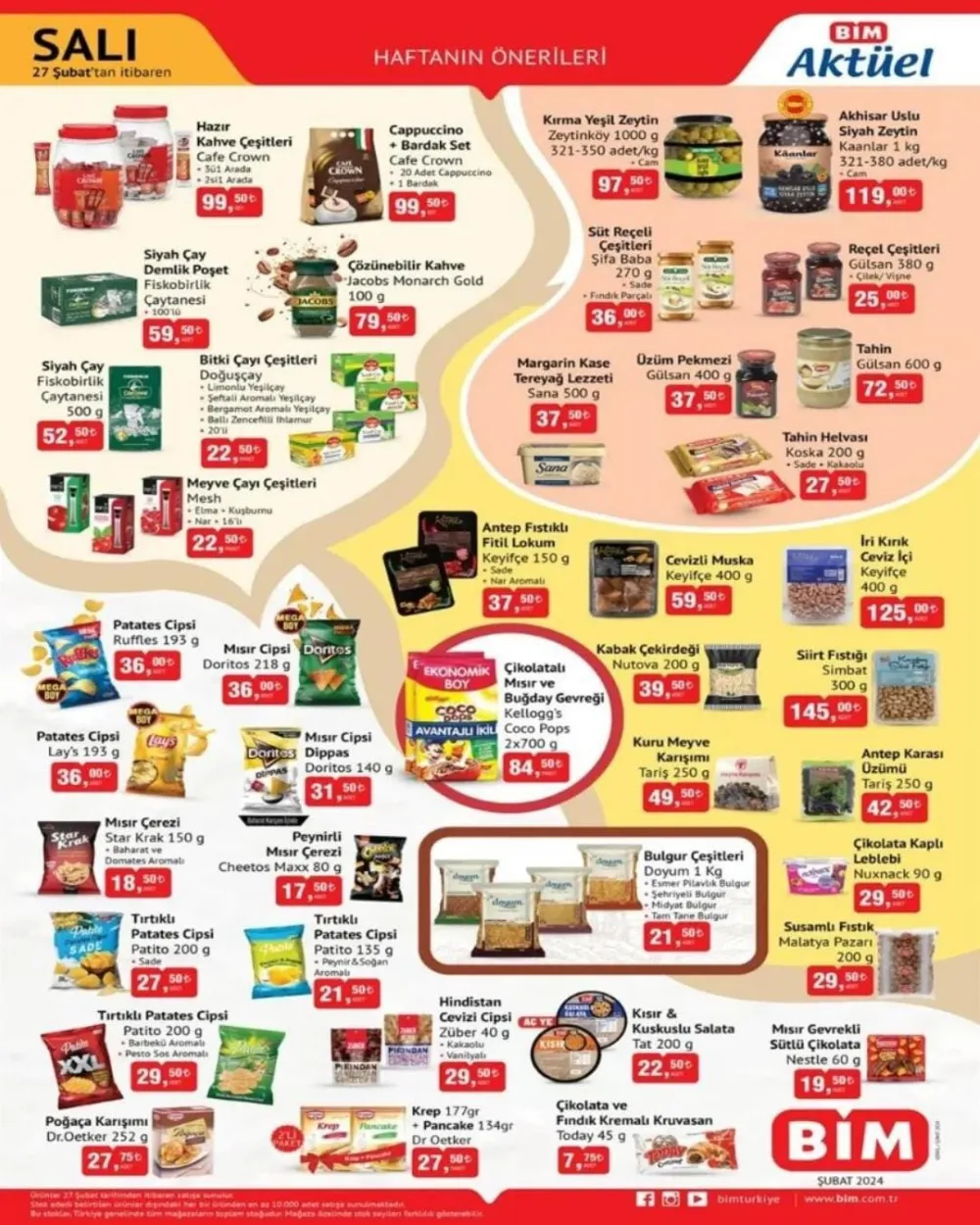 BİM'de yarın birçok üründe indirim fırsatı sunulacak. BİM market 27 Şubat 2024 salı aktüel ürünlerde, gıda ürünlerinde indirim yapılacak. Cafe Crown Hazır Kahve Çeşitleri 99,50 TL, Simbat Siirt Fıstığı 300 gr 145 TL, Doyum Bulgur Çeşitleri 1 Kg 21,50 TL.