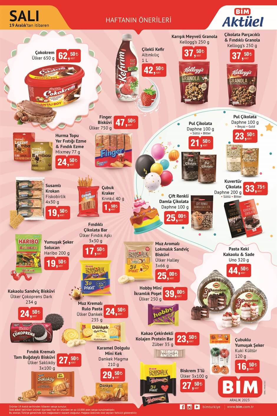 BİM 19 Aralık'tan itibaren satışa çıkaracağı aktüel ürünlerini yayımladı. Bu kapsamda BİM'de 2024 yıla özel küçük hediyeler bulunuyor. BİM'de bu hafta Ülker Çokokrem, Dekoratif Lamba, Molfix Bebek Bezi Ultra Fırsat Paketi, Kozalak & Kokina Led Işık Zinciri ve Işıklı Dekor gibi ürünler satılacak. İşte BİM 19 aralık 2023 tarihli aktüel ürünler kataloğu fiyat listesi...