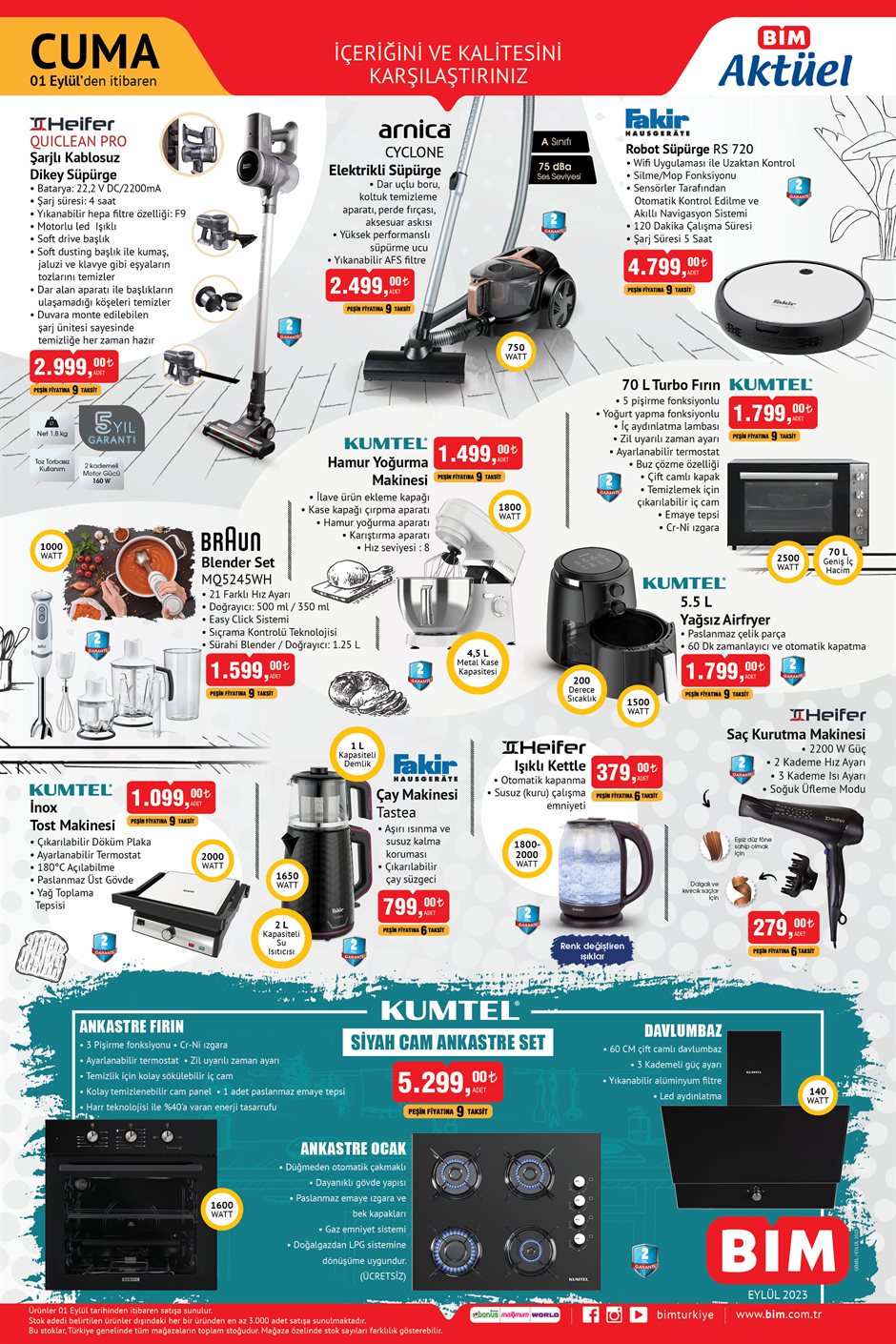 Eylül ayına girer girmez büyük indirimler yapacak olan BİM, yine sürpriz indirimlerle geri dönüyor. Bu kapsamda, Fakir robot süpürge 4 bin 799 TL’ye, Braun blender set 1.599 TL’ye, ışıklı kettle 379 TL’ye düşecek. İşte 1 Eylül 2023 BİM fiyat listesi...