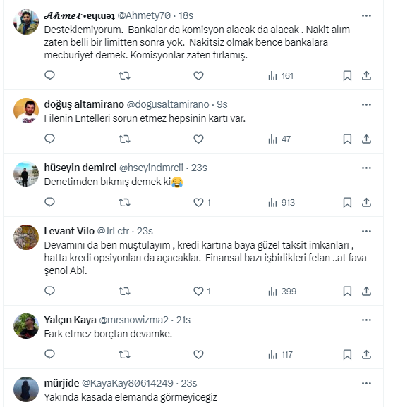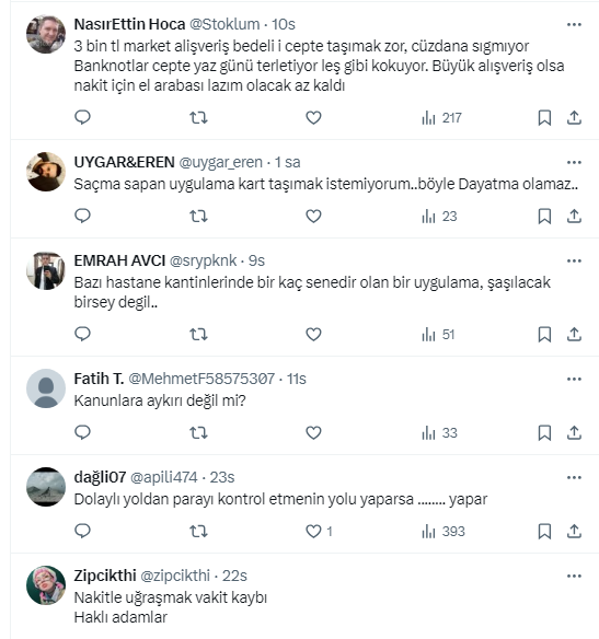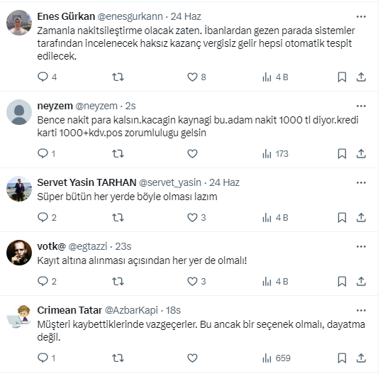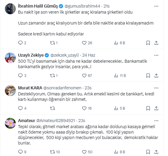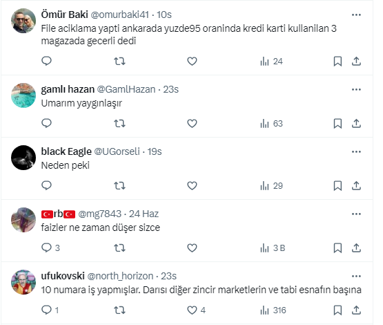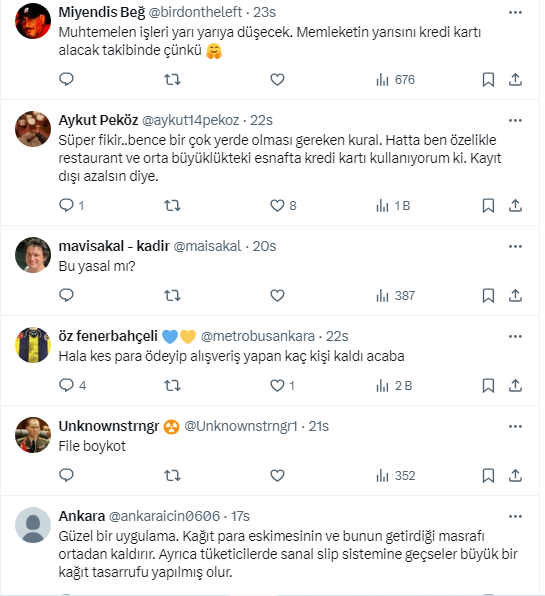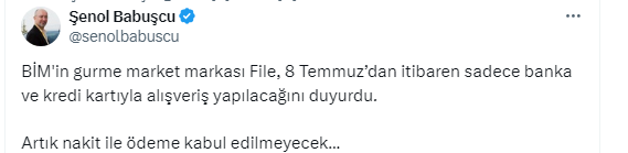 Ziraat Bankası eski Genel Müdür Yardımcısı ve Başkent Üniversitesi Uluslararası Finans ve Bankacılık Bölüm Başkanı Prof. Dr. Şenol Babuşcu, https://x.com/senolbabuscu X sosyal medya hesabından yaptığı paylaşımda, “BİM'in gurme market markası File, 8 Temmuz’dan itibaren sadece banka ve kredi kartıyla alışveriş yapılacağını duyurdu. Artık nakit ile ödeme kabul edilmeyecek” dedi. Takipçilerinden uygulamayı yerinde bulan da şarta bağlanmasını kabul etmeyen de oldu.
