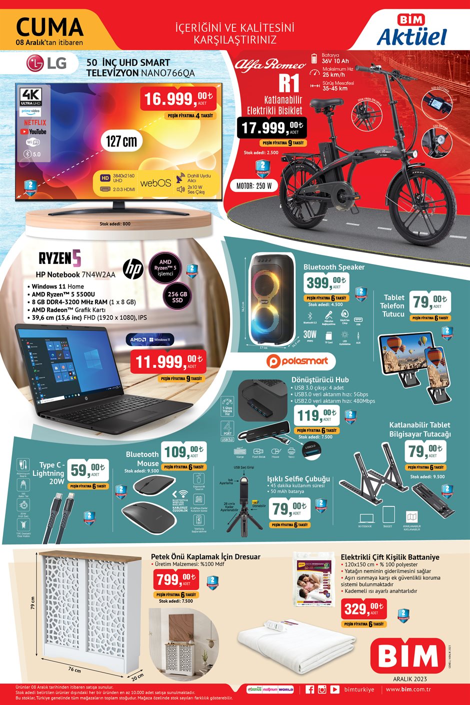 BİM 8 Aralık 2023 aktüel ürünler kataloğunu yayımladı. Her hafta belirli günlerde market raflarında satışa çıkarılan aktüel ürünler tüketiciler tarafından merakla takip ediliyor. BİM'de bu hafta HP 7N4W2AA Notebook, Benante 12 Parça Kahvaltı Seti, LG 50" UHD Smart Televizyon, Elektrikli Çift Kişilik Battaniye ve Molinella Çift Kişilik Kadife Yorgan satışa çıkarılacak. İşte BİM aktüel ürünler kataloğu...