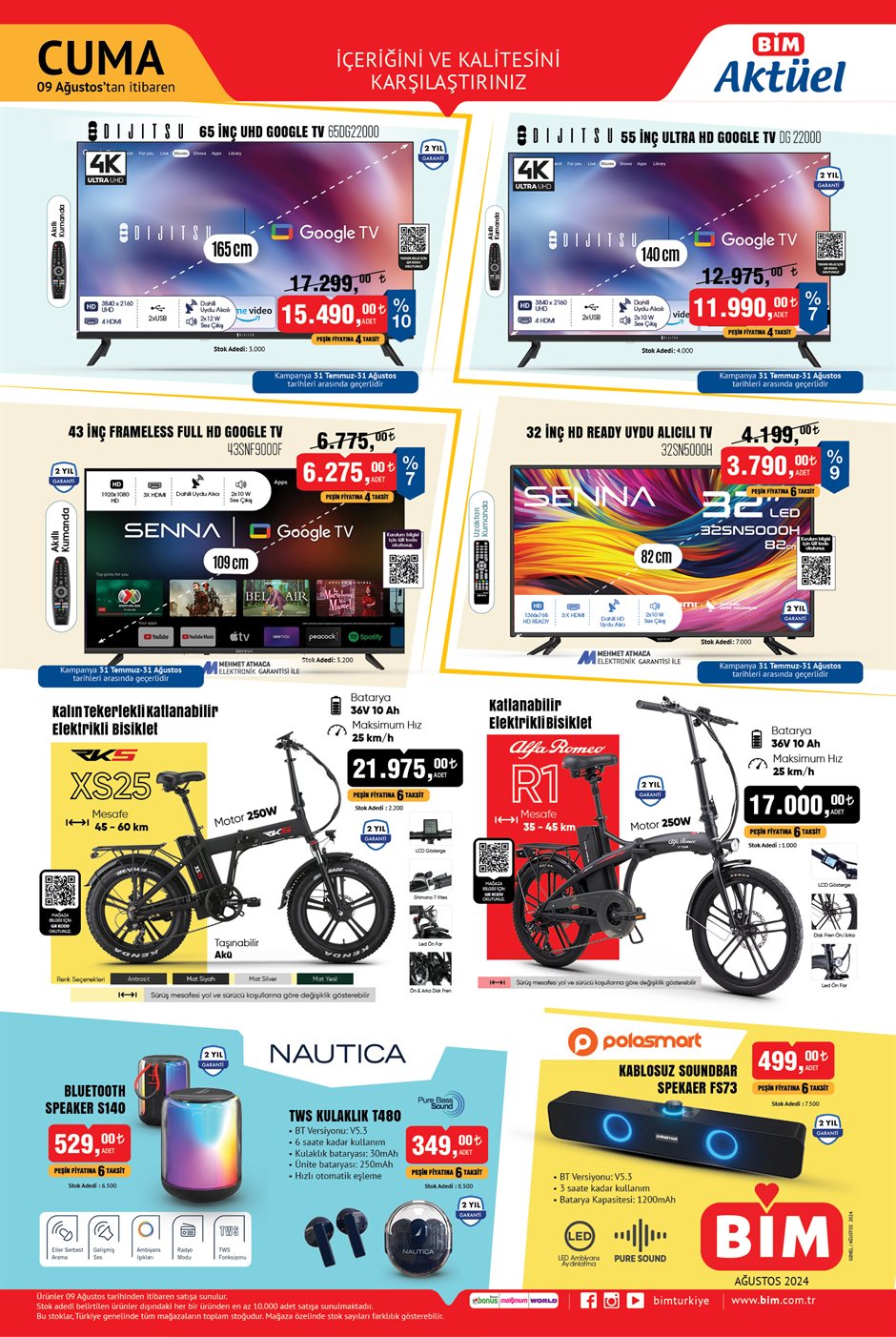BİM'de bu hafta 9 Ağustos ile 16 Ağustos 2024 tarihleri arasında geçerli olacak aktüel ürünler kataloğu belli oldu. 9 Ağustos'ta BİM'e katlanabilir elektrikli bisiklet geliyor. Bu Cuma BİM'e ne geliyor? Bu Cuma BİM'de neler var? 9 Ağustos 2024 Cuma BİM aktüel ürünler kataloğu...