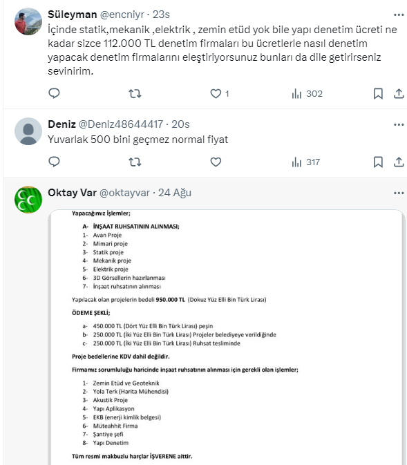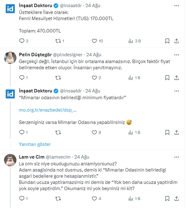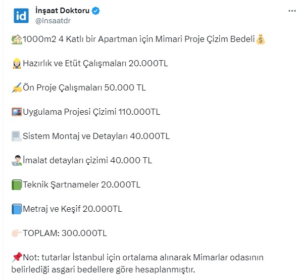 Mimarlar odasının belirlediği asgari bedellere göre, Bin metrekare 4 katlı bir apartman için mimari proje çizim bedeli şu şekilde; Hazırlık ve Etüt Çalışmaları, Ön Proje Çalışmaları, Uygulama Projesi Çizimi, Sistem Montaj ve Detayları, İmalat detayları çizim, Teknik Şartnameler ve Metraj ve Keşif olmak üzere toplam 300 bin TL olarak belirlendi. İşte İnşaat Doktoru'nun sosyal medya hesabı X'ten yaptığı o paylaşım....