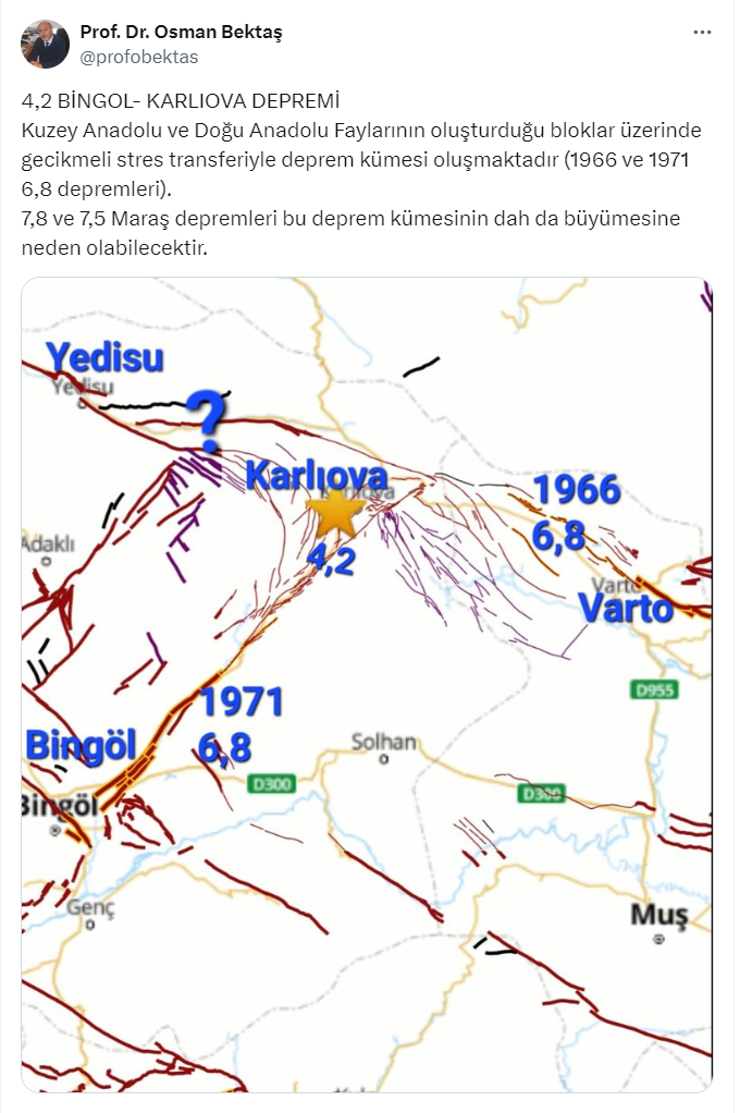 Osman Bektaş resmi sosyal medya hesabı https://x.com/profobektas üzerinden yaptığı paylaşımda Kuzey Anadolu ve Doğu Anadolu faylarının oluşturduğu bloklar üzerinde gecikmeli stres transferiyle deprem kümesi oluştuğunu söyledi. Osman Bektaş ayrıca paylaşımında Kahramanmaraş merkezli depremlerin bu deprem kümesinin daha da büyümesine neden olabileceğini de dile getirdi.