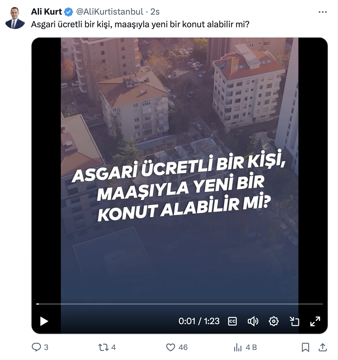 Ali Kurt resmi sosyal medya hesabı üzerinden https://x.com/AliKurtistanbul üzerinden yaptığı paylaşımda bugünkü enflasyonist ortamda maalesef bir asgari ücretlinin bir konuta erişmesi pek mümkün olmadığını belirterek, “Bunu basit bir örnekle anlatmak gerekirse günümüzde 1 metrekare inşaatın metrekare birim maliyeti 27 bin TL, yani bir asgari ücretli, bir inşaatın maliyetinin yüzde 80’ini karşılayamıyor. Bu rakamın içerisinde maalesef finans maliyeti yok, arsa maliyeti yok" dedi.