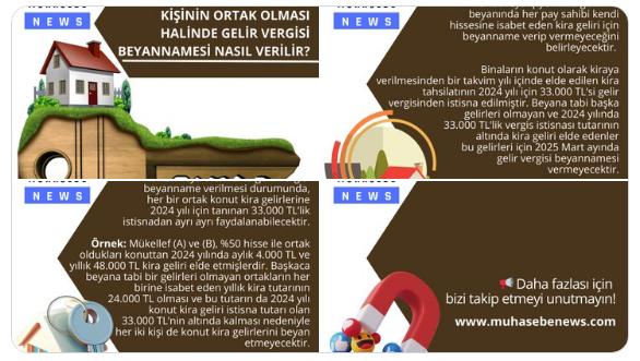 Ortak veya ortaklarca gelir vergisi beyanname verilmesi durumunda, her bir ortak konut kira gelirlerine 2024 yılı için tanınan 33.000 TL’lik istisnadan ayrı ayrı faydalanabilecektir.