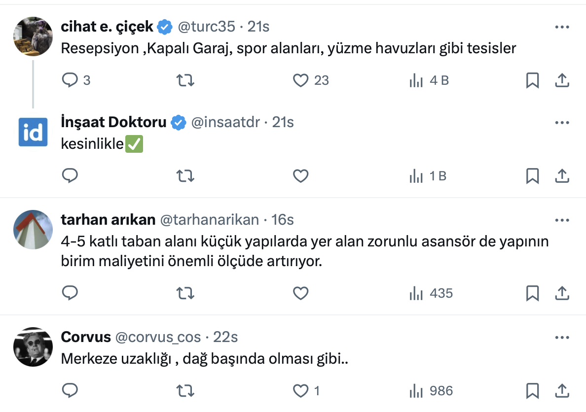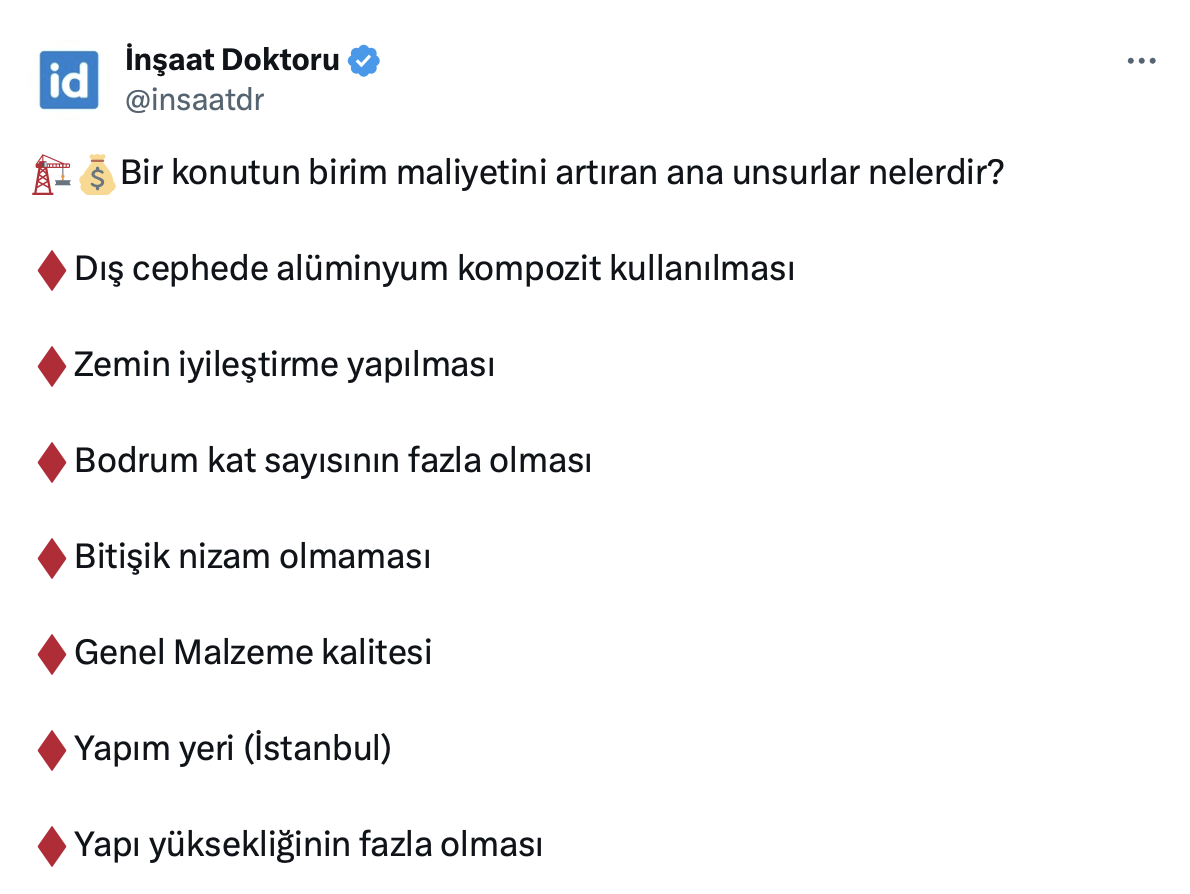 50,2 bin takipçili İnşaat Doktoru resmi sosyal medya hesabı üzerinden yaptığı paylaşımda bir konutun birim maliyetini artıran ana unsurlarını açıkladı.