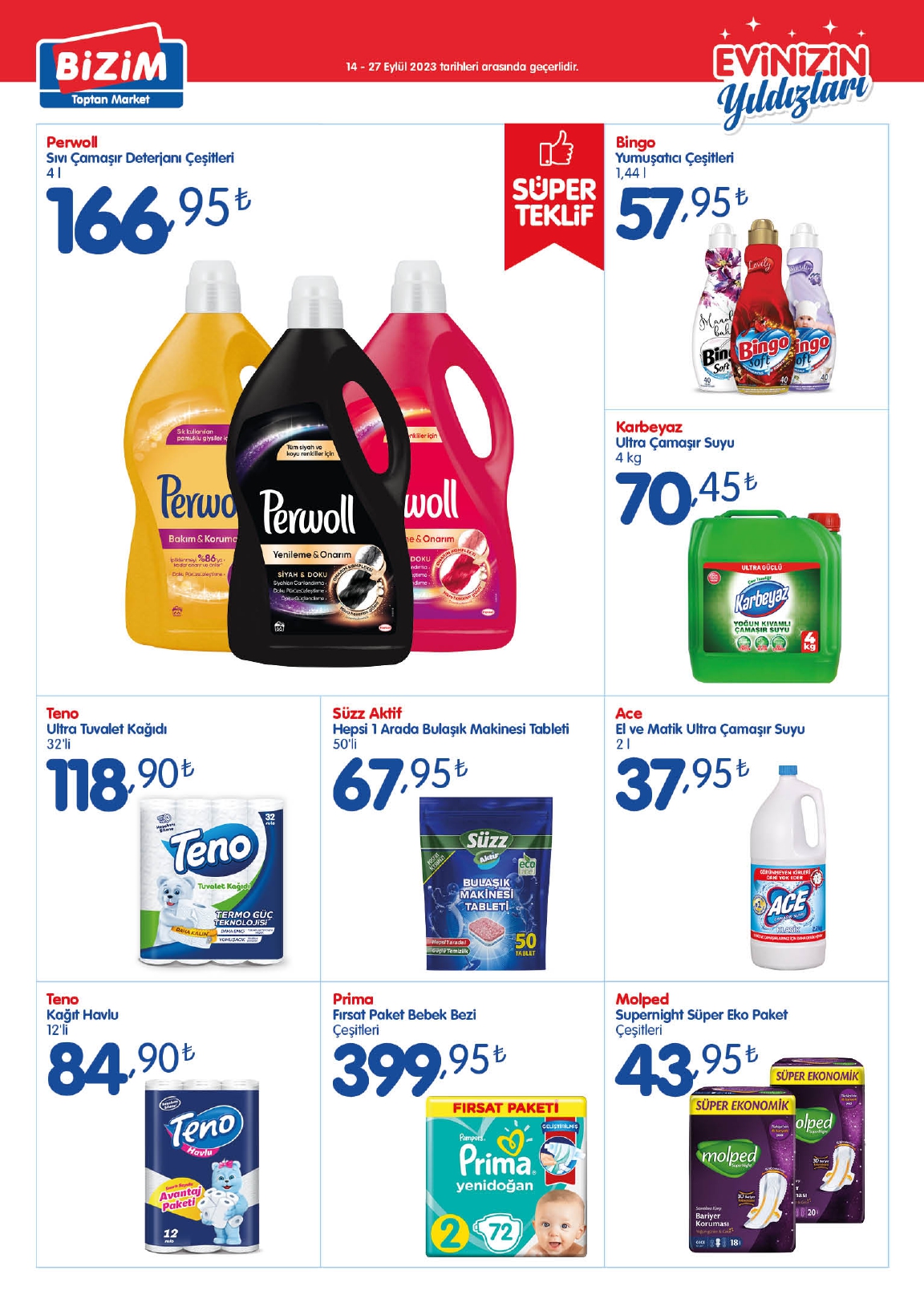 Bizim Toptan Market’tin yeni indirimli ürünler kataloğu belli oldu. Bu kapsamda, Perwoll sıvı çamaşır deterjanı 166,95 TL’ye, Prima bebek bezi 399,95 TL’ye, mısır yağı 37,90 TL’ye düştü. İşte 23 Eylül 2023 fiyat listesi...