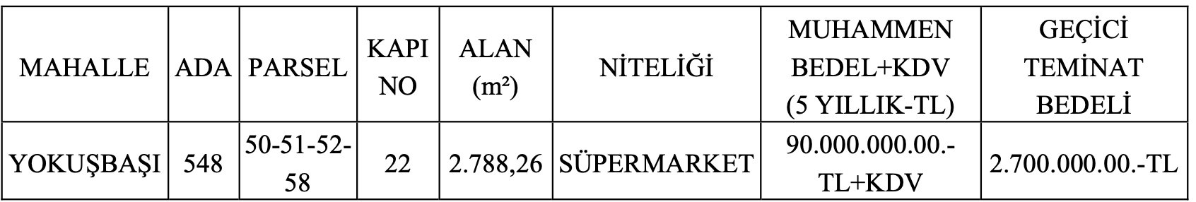 2 bin 788,26 metrekare alana sahip süpermarketin 5 yıllık kira bedeli 90 milyon TL olarak açıklanırken, geçici teminat bedeli ise 2 milyon 700 bin TL olarak açıklandı.