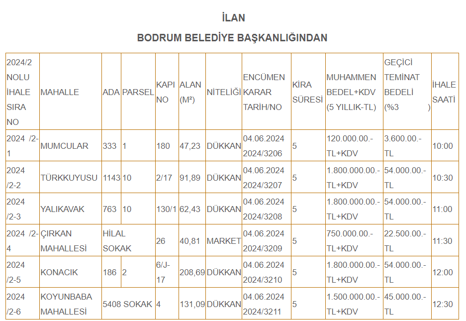 Bodrum Belediyesinin mülkiyeti ile hüküm ve tasarrufunda bulunan yukarıda niteliği yazılı; 6 adet taşınmaz 2886 Sayılı Devlet İhale Kanunu’nun 45. maddesi gereğince açık arttırma usulüne göre kiralama ihalesine çıkartılacaktır.