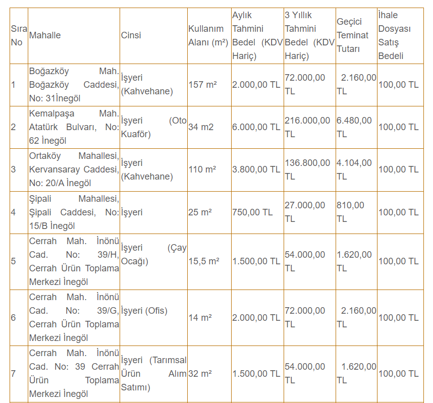 Belediyemiz mülkiyetinde bulunan ve aşağıdaki tabloda tapu kaydı ve nitelikleri belirtilen işyerlerinin Belediye Encümenince 25.06.2024 Salı günü ve saat 11.00’da İnegöl Belediyesi Yeni Hizmet Binası Encümen Toplantı Salonunda (Kemalpaşa Mah. Adnan Menderes Bulvarı Yeni Belediye Hizmet Binası No: 1 İnegöl/BURSA) 2886 sayılı Devlet İhale Kanunu’nun 35/a maddesince kapalı teklif usulü ile 3 (Üç) yıl süreli kiraya verilecektir.