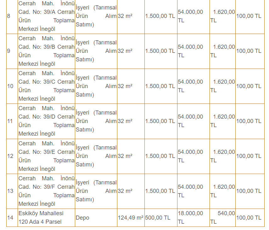 Bodrum ve Bursa'da yer alan 20 gayrimenkul kiraya verilecek. Bodrum'da yer alan market ve dükkanların muhammen bedelleri 120 bin TL ile 1 milyon 800 bin TL arasında değişirken, İnegöl'de yer alan gayrimenkullerin muhammen bedelleri 18 bin TL ile 216 bin TL arasında değişiyor.
