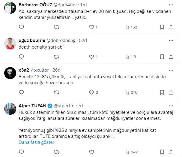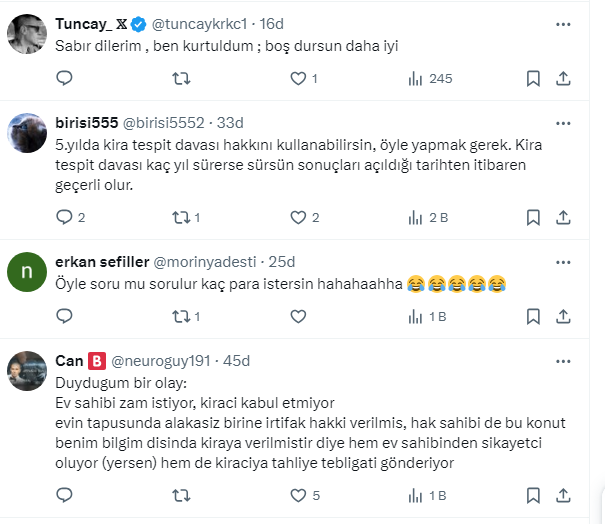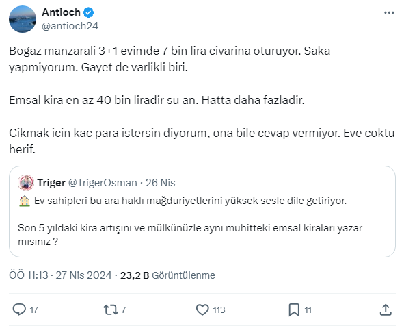 Ev sahipleri eski kiracılarından, kiracılar ise ev sahiplerinden yakınıyor. Yüzde 25 kira artış bedeli ev sahiplerini zor duruma düşürdü. Bundan dolayı ev sahibi ve kiracılar arasında gerilim yaşanıyor. Ev sahibi ve kiracı kavgaları son zamanlarda gittikçe büyürken, kiracılar ev sahiplerini, ev sahipleri kiracıları suçluyor. Sosyal medya hesabı X'ten paylaşım yapan Antioch isimli bir ev sahibi kiracısının Boğaz Manzaralı evinde 7 bin TL kira ödediğini söyledi. Evin şu anki kira bedelinin 40 bin TL olduğunu belirten ev sahibi kiracısına 'evime çöktü' diyerek isyan etti. İşte o paylaşım ve gelen yorumlar...