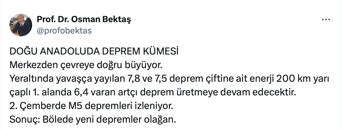 Prof. Dr. Osman Bektaş da resmi sosyal medya hesabı https://x.com/profobektas üzerinden yaptığı paylaşımda Doğu Anadolu’da deprem kümesinin merkezden çevreye doğru büyüdüğünü belirterek, 6,4 varan artçı deprem üretmeye devam edeceğini söyledi.