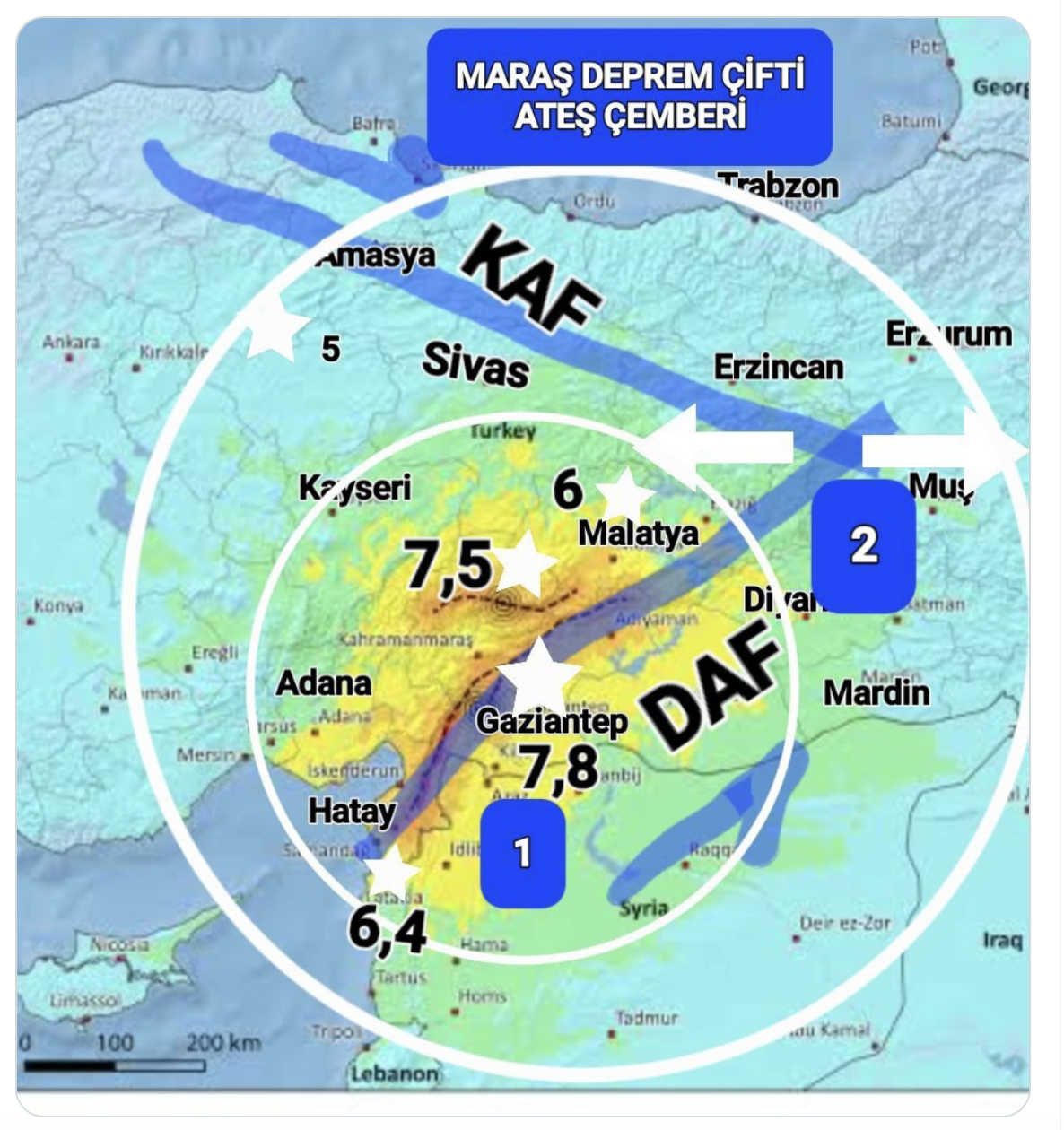 Yeraltında yavaşça yayılan 7,8 ve 7,5 deprem çiftine ait enerji 200 km yarı çaplı 1. alanda 6,4 varan artçı deprem üretmeye devam edecektir. 2. Çemberde M5 depremleri izleniyor.